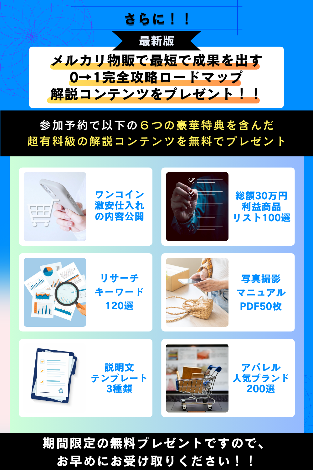 メルカリ物販0→1ロードマップ作成会は、あなたがメルカリ物販を習得するためのレシピを、今日からできるレベルで提供する初めての企画です。